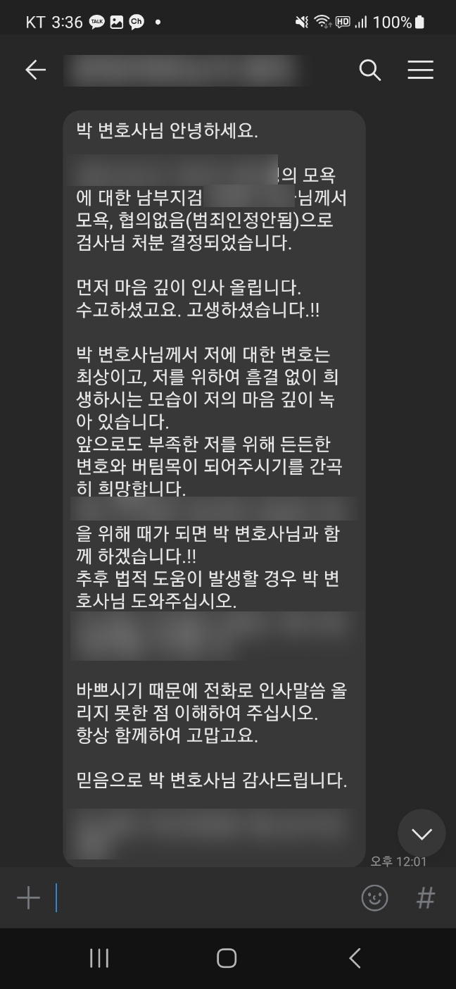 모욕죄 혐의없음 처분 결정된 의뢰인의 감사 문자입니다.