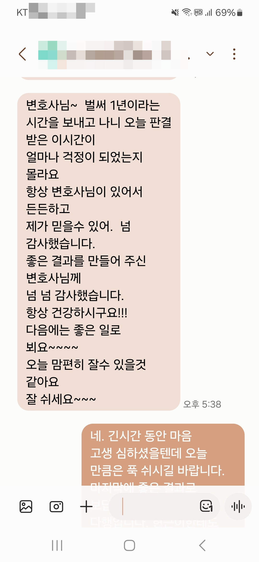판결 후 박형권 변호사님께 감사 인사를 보내주셨습니다.