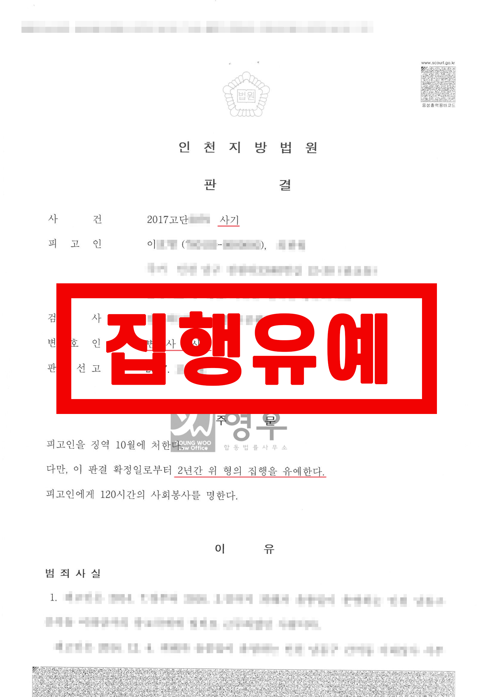 법원은 위와 같은 의뢰인의 사정과 이 사건 범행의 발생경위를 유리한 정상으로 참작하여 의뢰인에게 집행유예를 선고하였습니다.