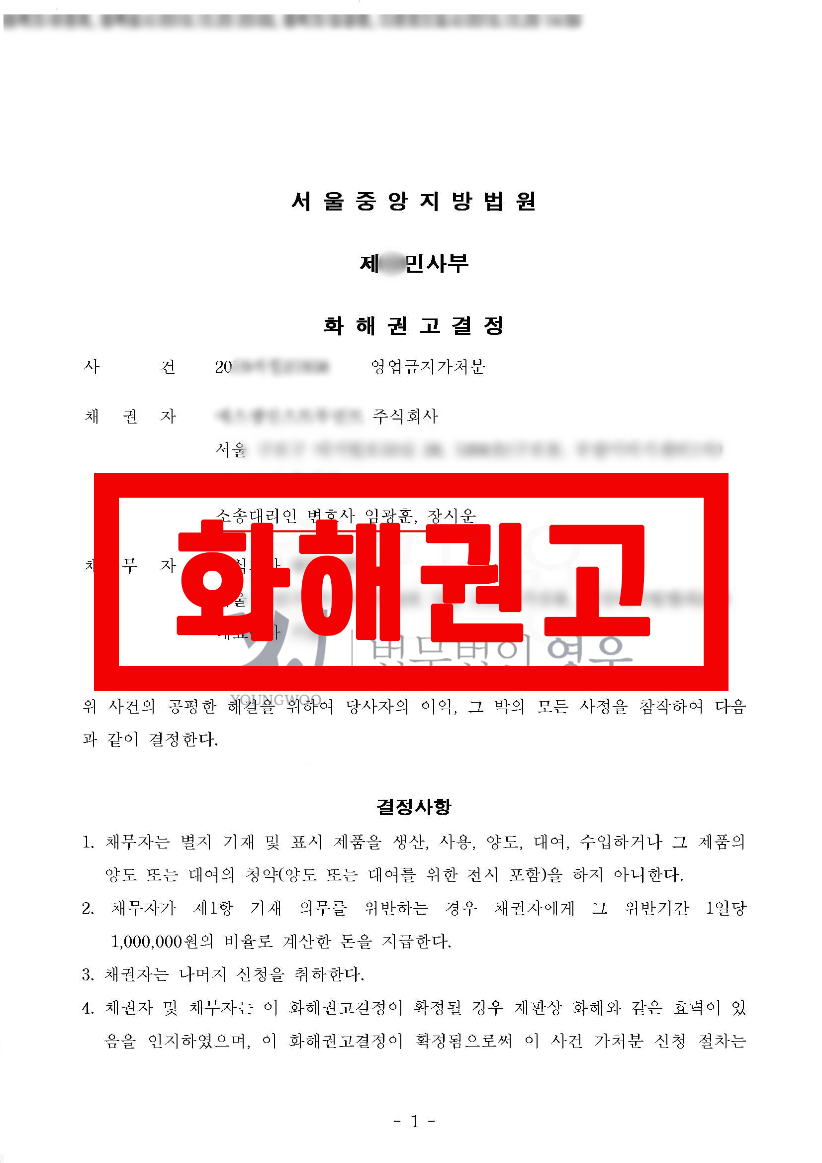 1. 채무자는 별지 기재 및 표시 제품을 생산, 사용, 양도, 대여, 수입하거나 그 제품의 양도 또는 대여의 청약(양도 또는 대여를 위한 전시 포함)을 하지 아니한다.