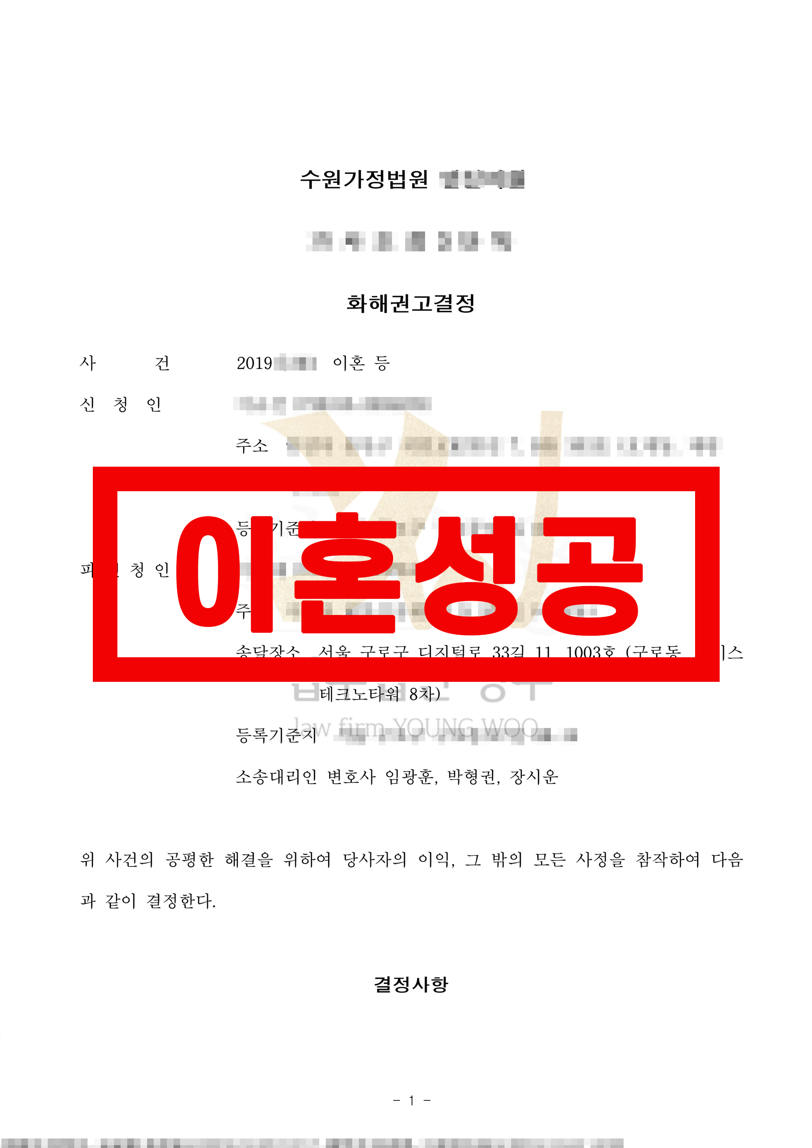 법무법인 영우는 피신청인의 법률상 대리인이 되어 해당 사건 조정 절차에 참석하여 빠르게, 당사자가 참석하지 않고 이혼을 할 수 있었습니다.