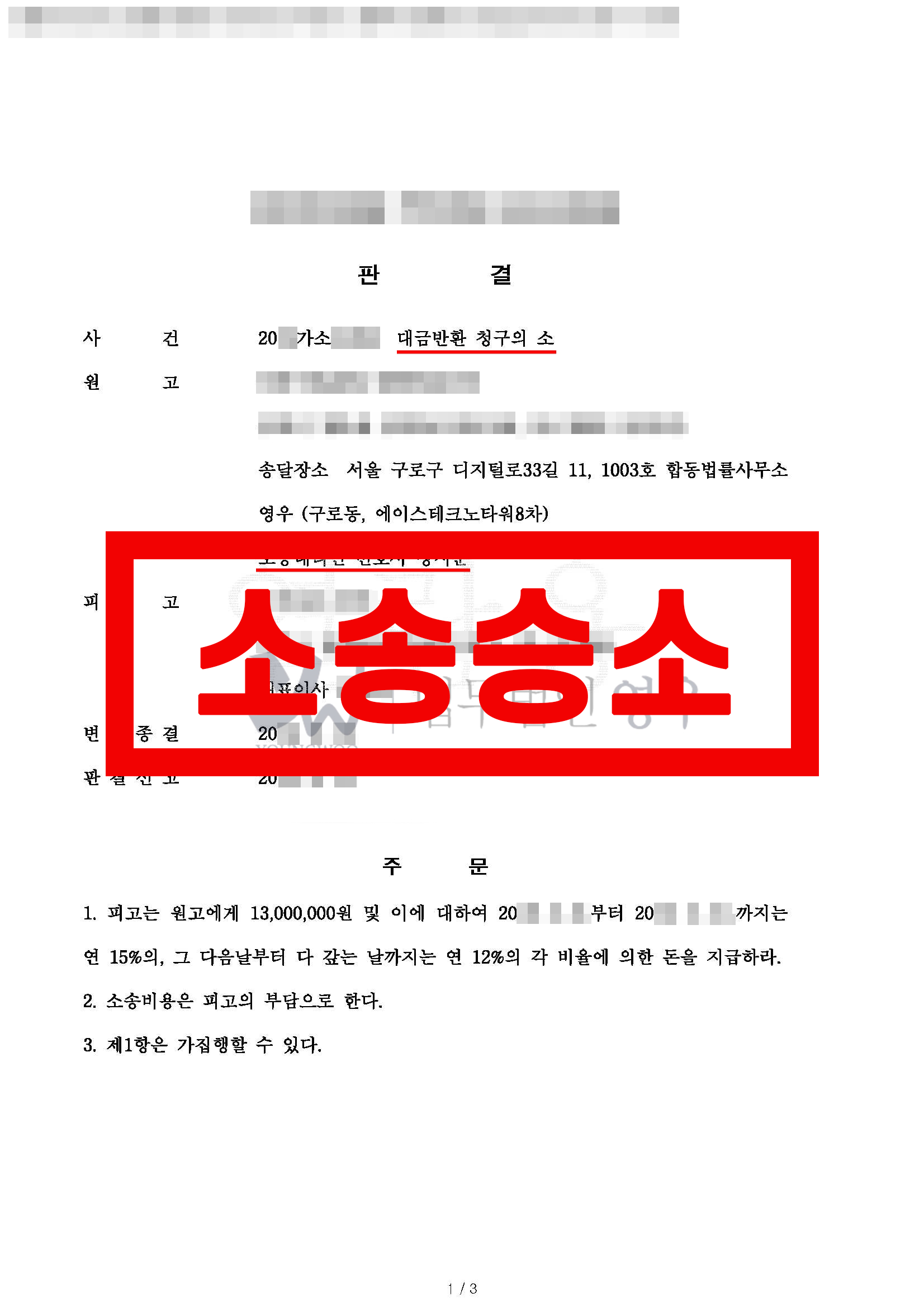 1. 피고는 원고에게 13,000,000원 및 이에 대하여 20**.*.**.부터 20**.*.**.까지는 연15%의, 그 다음날부터 다 갚는 날까지는 연 12%의 각 비율에 의한 돈을 지급하라.
