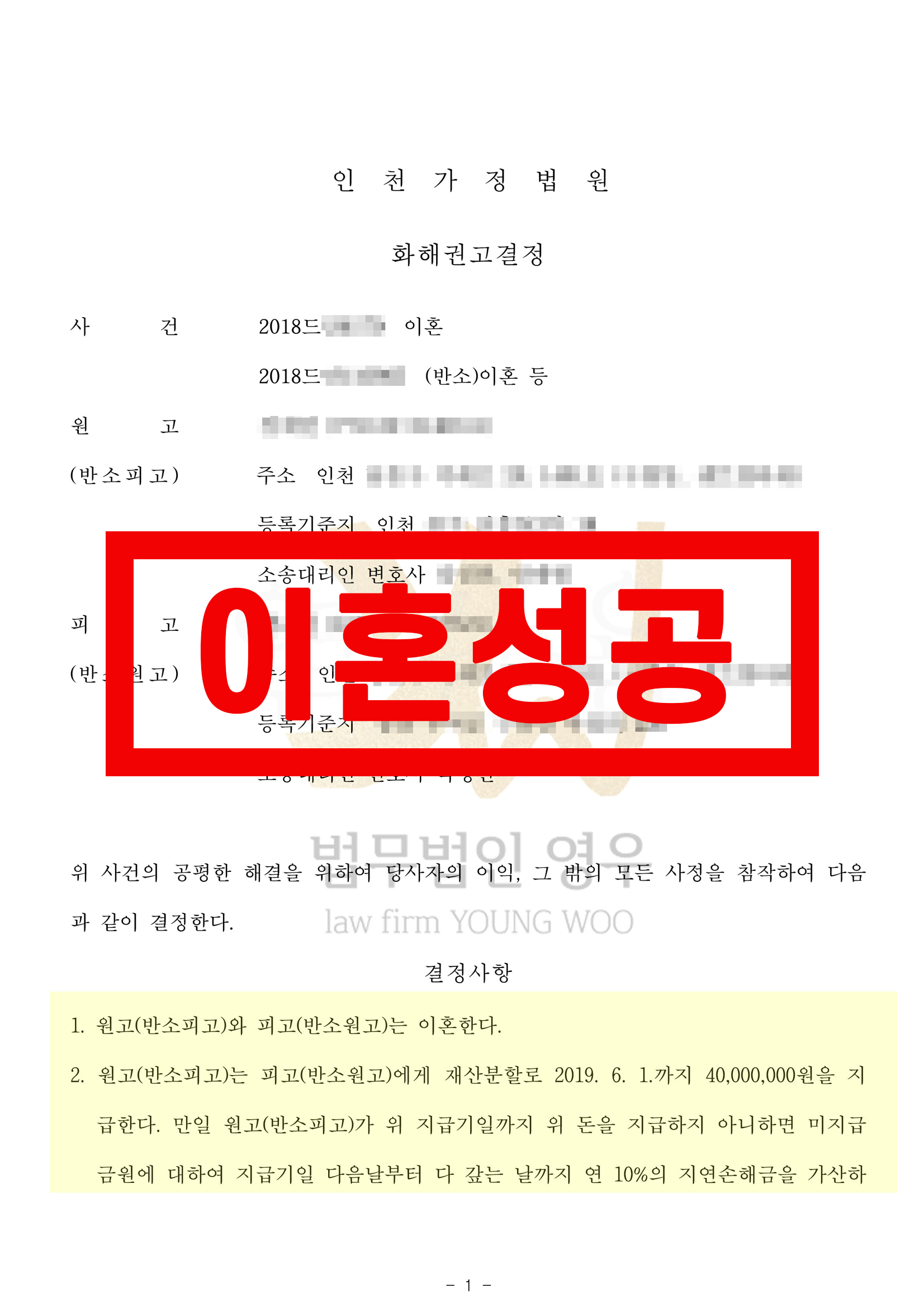 2. 원고(반소피고)는 피고(반소원고)에게 재산분할로 2019. X. X.까지 40,000,000원을 지급한다. 만인 원고(반소피고)가 위 지급기일까지 위 돈을 지급하지 아니하면 미지급 금원에 대하여 지급기일 다음날부터 다 갚는 날까지 연 10%의 지연손해금을 가산하여 지급한다.