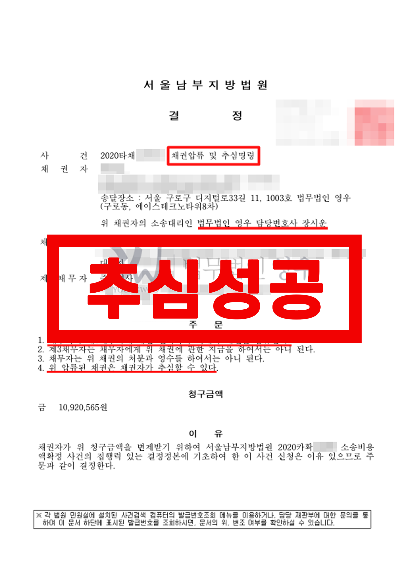 청구금액 10,920,565원 채권압류 및 추심명령 성공