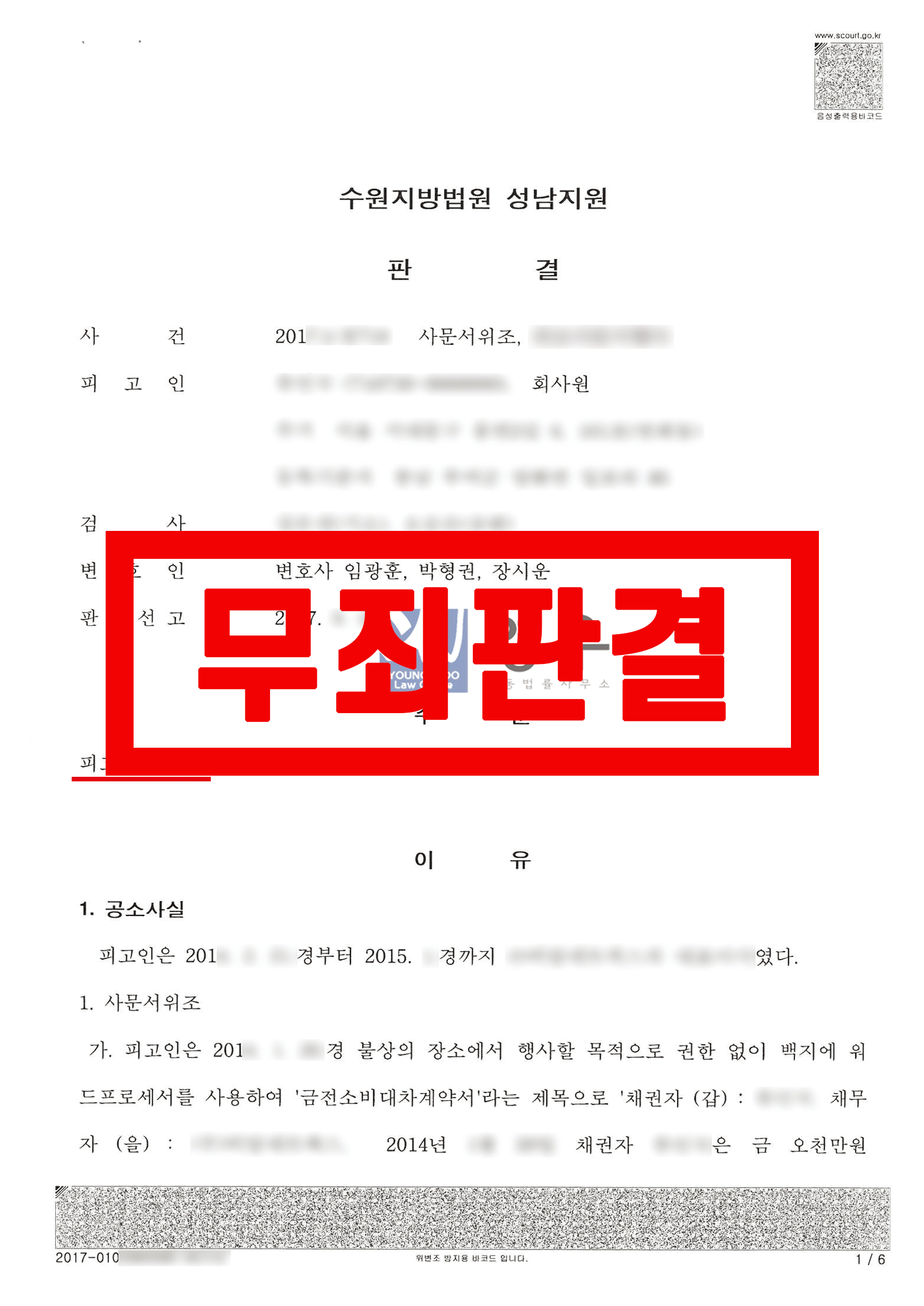 이 사건의 의뢰인은 4차례에 걸쳐 권한없이 백지에 워드를 사용하여 금전소비대차계약서를 위조하였다는