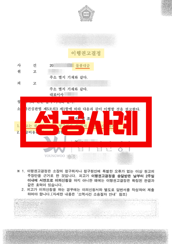 원고와 피고의 약정은 법적으로 그 실체가 분명하여 명백히 유효한 계약이며 ,따라서 피고는 원고에게 잔금을 모두 지급할 의무가 있고, 한편 피고는 이를 이행하지 않고 있다는 사실관계를 밝히는데 집중했습니다. 이에 법무법인 영우는 물품대금청구의 소를 제기하였고 ㅁㅁ지방법원은 이를 받아들여 이행권고결정이 선고되었습니다.
